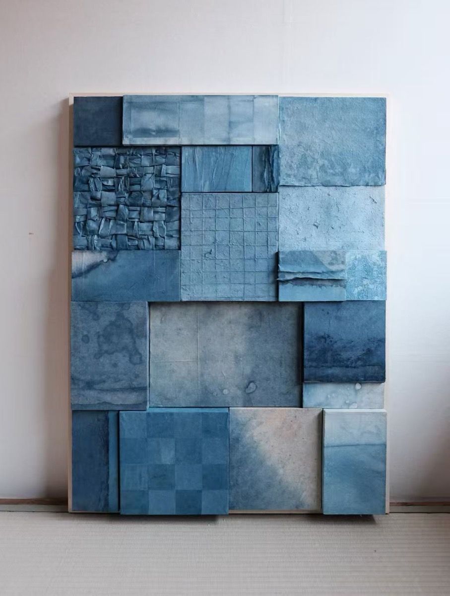 Seventeen cardboard boxes are pieced together to form an artwork, each framed on handmade paper dyed indigo. Varying shades of blue, different textures, and papercraft techniques intertwine within the boxes' undulating structure to create a unique visual narrative. The warmth of handcrafting, natural dyeing, and spatial folding combine to construct this tangible blue scroll. The boxes' opening and closing mechanism subtly evokes a sense of ritual in unpacking; every crease and dye mark pays homage to the warmth and craftsmanship of handmade paper art and packaging.