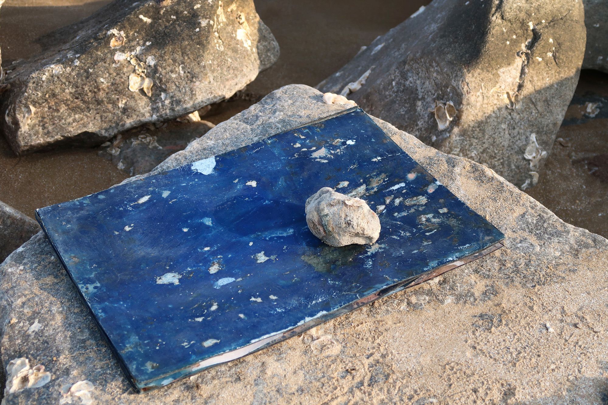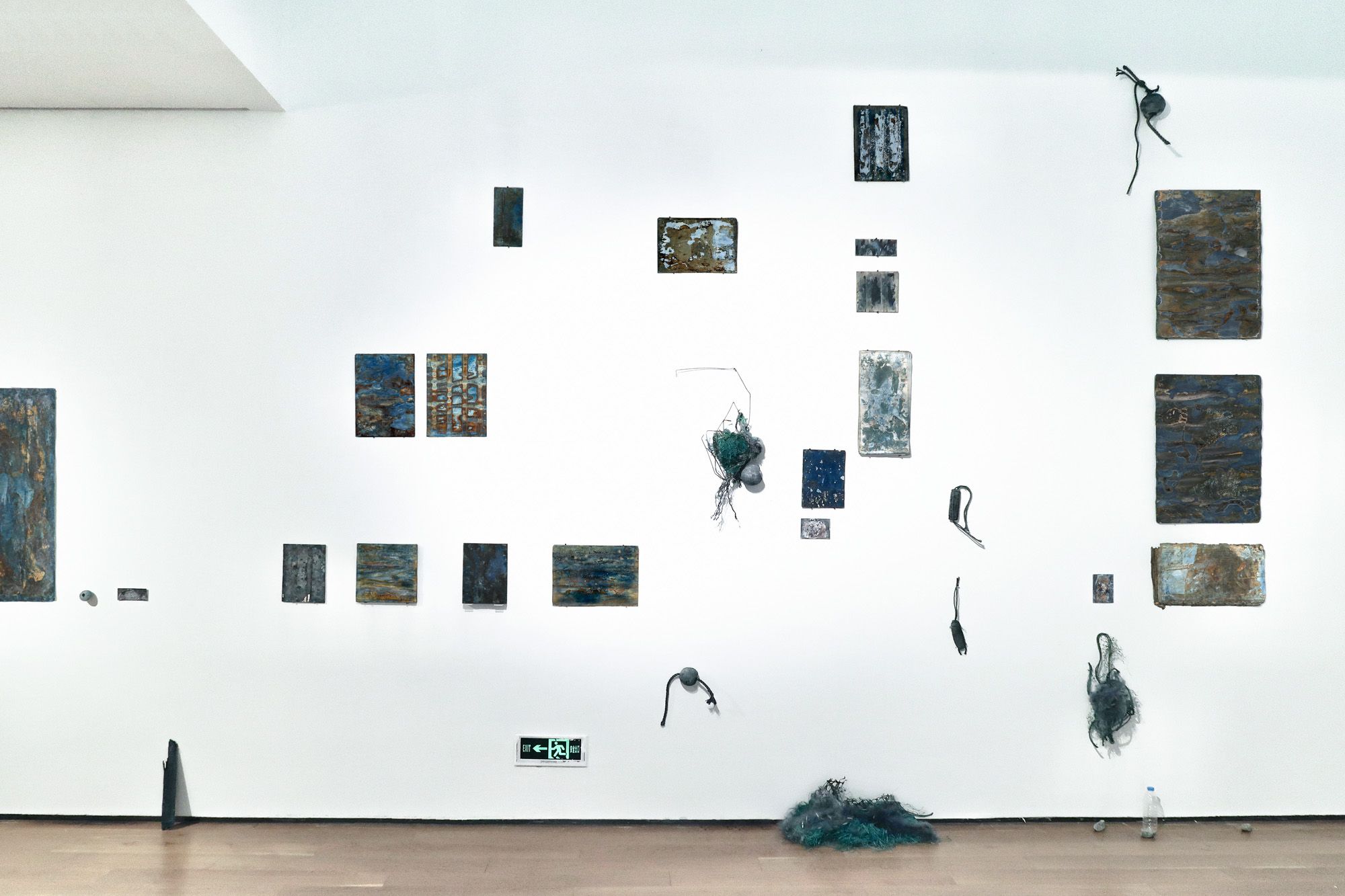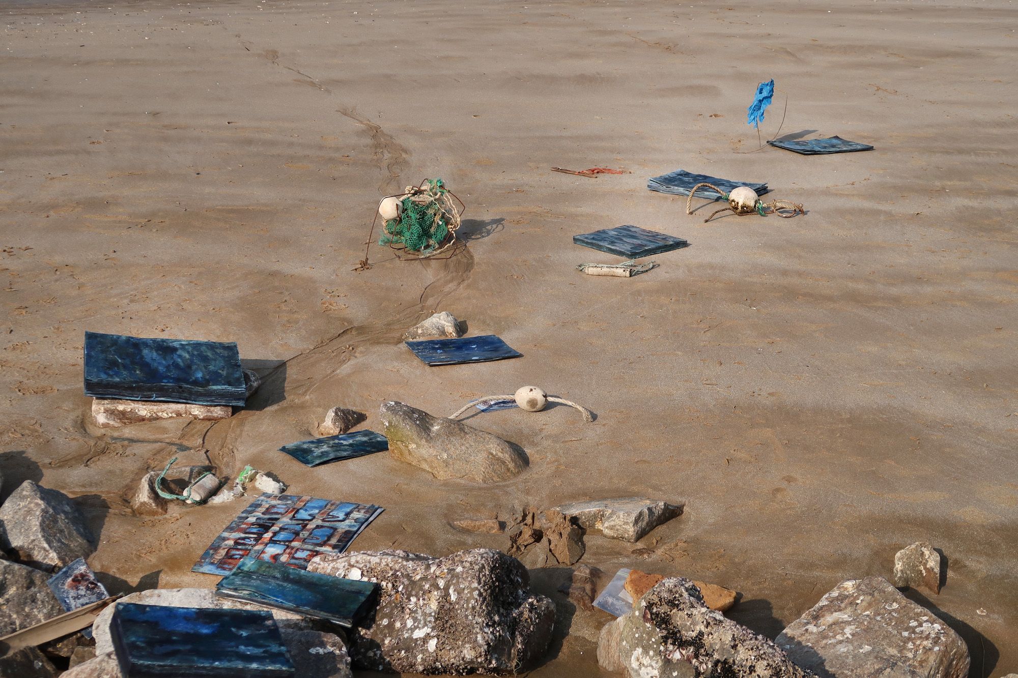 我的家乡位于海边城市,拥有全球装机容量最大的核电站。日本核泄漏及核污水排海事件,更强烈的牵扯着这座城市居民的心情。核污水排海,土壤、空气、海水之下的生物都受到不同程度的污染。作品通过靛蓝和柿漆浸染纸张,两种原生态的植物染液象征看似相同的两种水,直观地呈现海面之下不同程度的侵蚀污染,海滩上废弃物和核污水同样都是人的行为结果,作品试图阐明在核污水影响之外,更重要的是人的行为对海洋的影响。