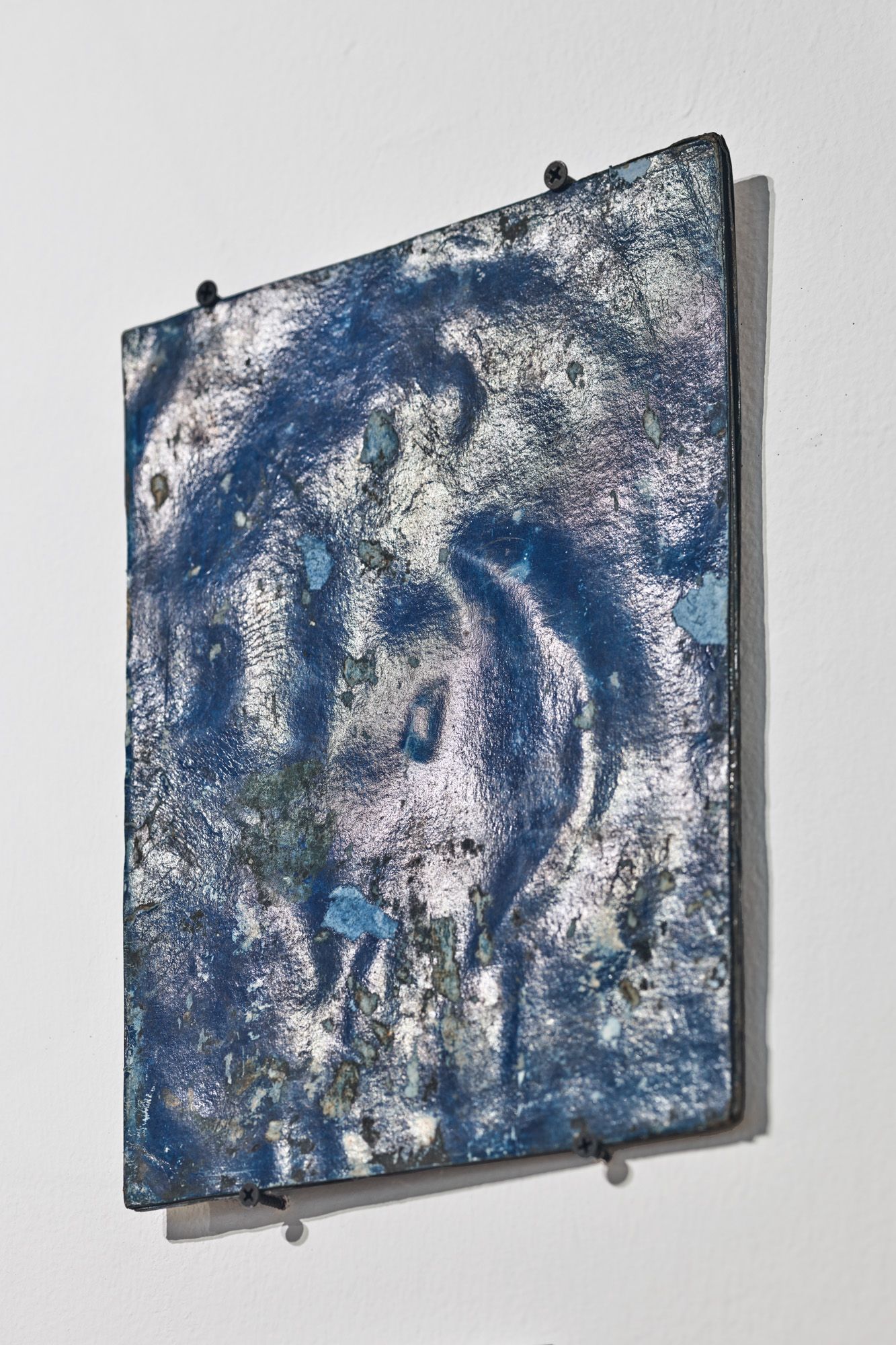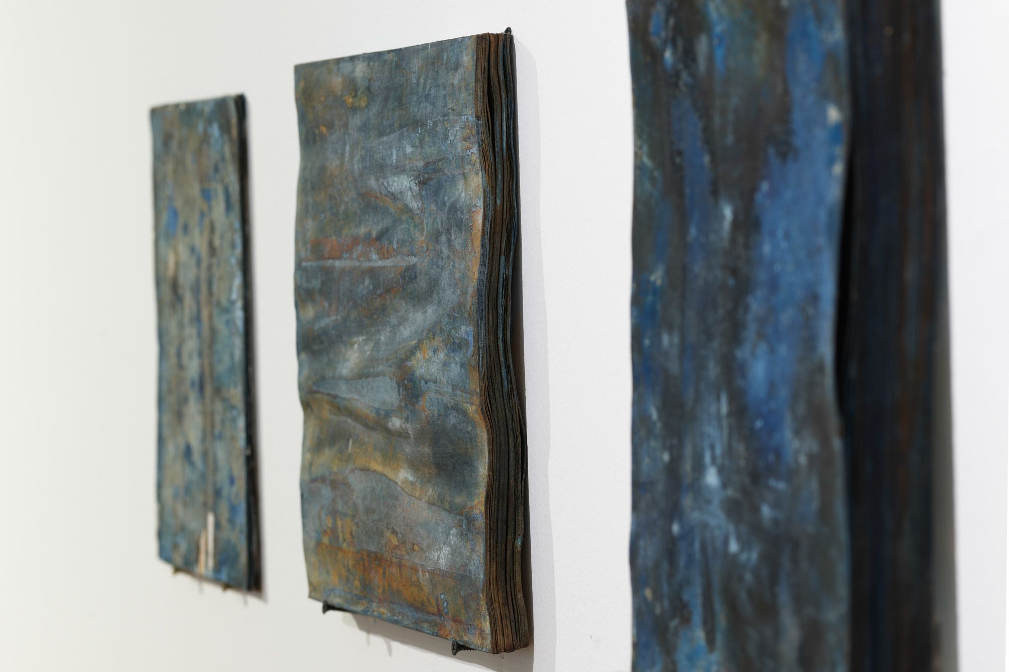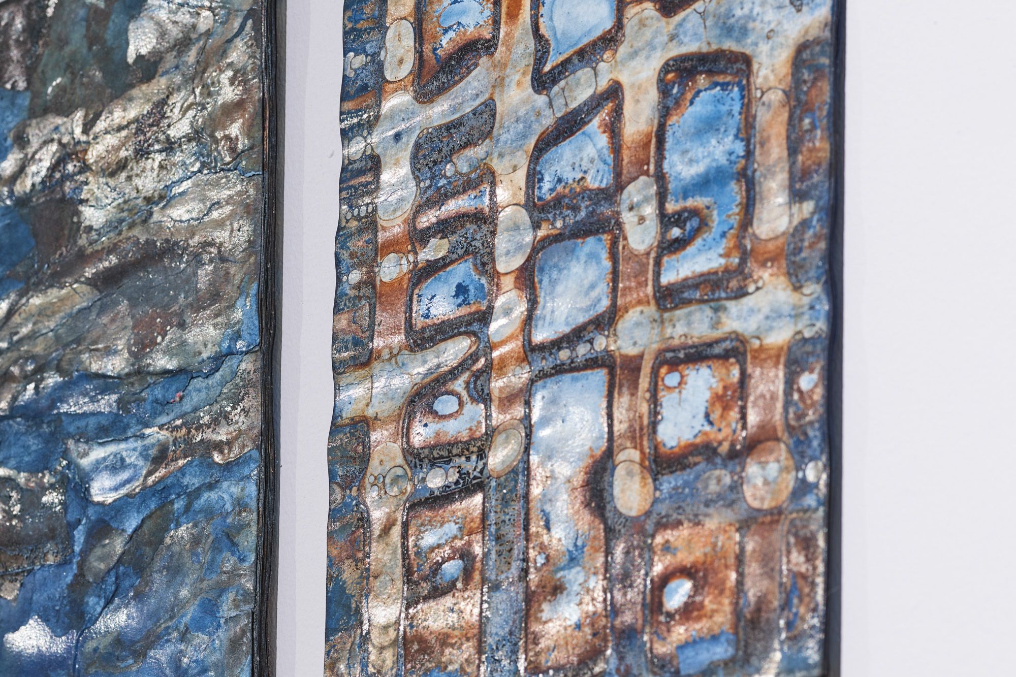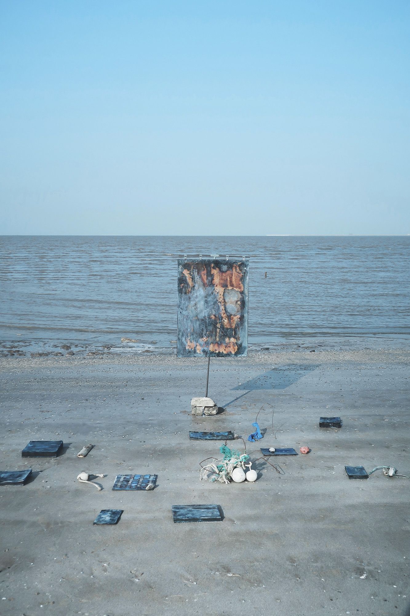 我的家乡位于海边城市,拥有全球装机容量最大的核电站。日本核泄漏及核污水排海事件,更强烈的牵扯着这座城市居民的心情。核污水排海,土壤、空气、海水之下的生物都受到不同程度的污染。作品通过靛蓝和柿漆浸染纸张,两种原生态的植物染液象征看似相同的两种水,直观地呈现海面之下不同程度的侵蚀污染,海滩上废弃物和核污水同样都是人的行为结果,作品试图阐明在核污水影响之外,更重要的是人的行为对海洋的影响。