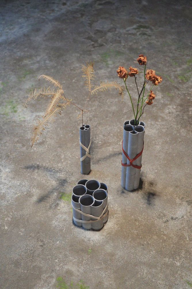 《节点》是一系列花瓶,是在研究传统竹工艺及其当代形式的基础上发展起来的。这些作品起源于对城市建筑工地金属框架的观察,这些金属结构具有象征意义,在焊缝等结构上与竹子的自然结构相呼应,并通过金属3D打印得以呈现。这些形状的灵感源自宁波保国寺的瓜棱柱结构,每一部分都可以通过传统竹编技艺组装在一起,这也让人想起启发其形状的原始材料。