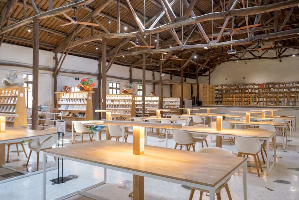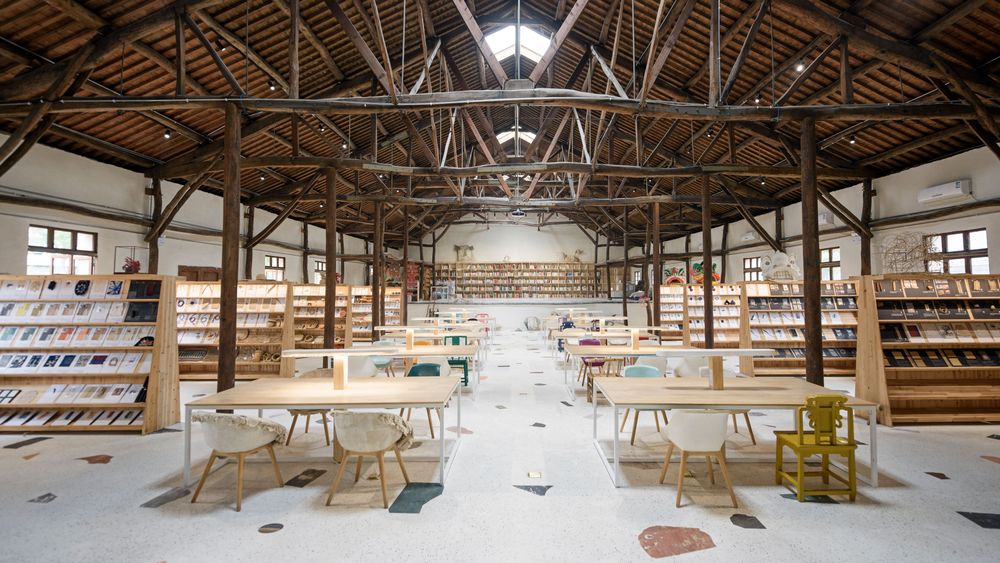 礼堂的修复邀请了村里五十年前参与过礼堂建设的老木工蒋卫龙。老木匠不用尺子,礼堂的梁柱也弯弯曲曲,张雷很喜欢这样流动的线条,惊叹工匠的智慧。在工业设计师张雷的眼里,弯曲更有承载力,而力学就是美学。历经十个月,十个月后,礼堂成了融设计图书馆的新家。